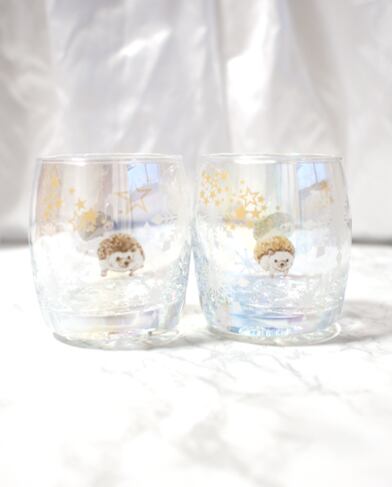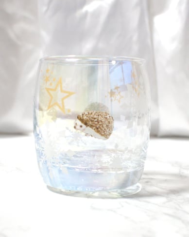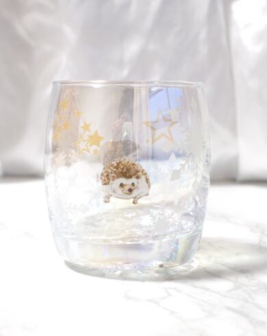 星空と雪の結晶を眺めているハリネズミさんのグラスになります。
